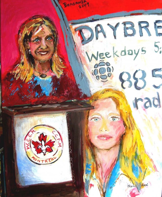 16x20 ins, acrylic. On November 15th, Nancy Wood, host of CBC Radio's DAYBREAK came to speak to the Womens Canadian Club about her life as a woman journalist. The large white publicity poster was propped up beside her as she spoke. I had been rooting for her to be our morning host on Radio One for many years and am glad she made it. POST SCRIPT: As of early February 2010, Nancy Wood has disappeared mysteriously from morning radio and her fans are naturally irate. Join the Facebook page below to bring her back !