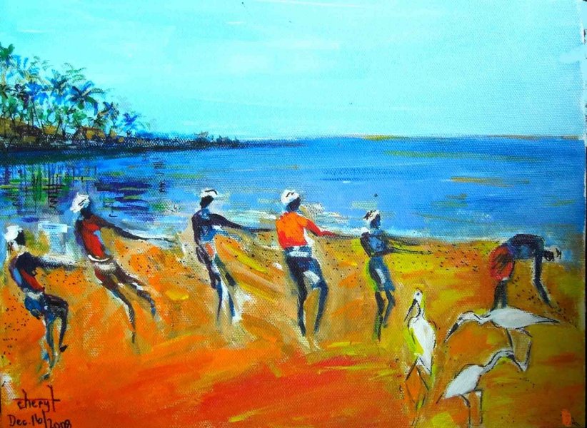 9 x 12 ins. Acrylic. December 2008, Kerala. This was the sight early every morning. Often the catch only yielded one basket of edible fish. Large brown jellyfish would be thrown back into the ocean. "THE SEA IS FLOWING EVER. THE LAND RETAINS IT NEVER" - Goethe.