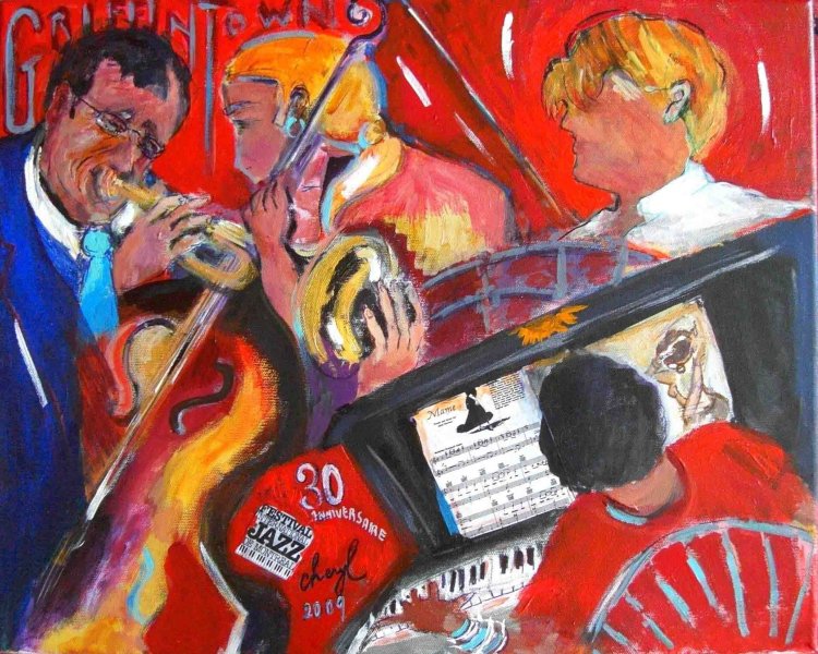16 x 20 ins, mixed media. July 2, 2009. That's me on the piano. Picking up the energy of the 30th anniversary of the MONTREAL JAZZ FESTIVAL which I visited yesterday. Collection of the artist.