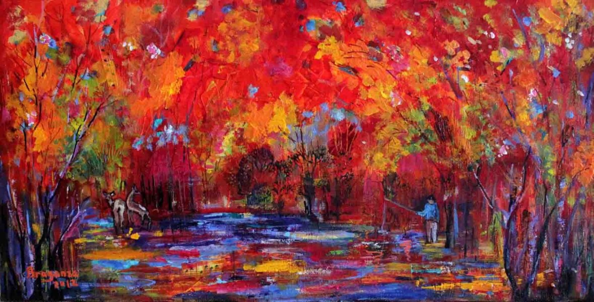 10 x 20 ins, acrylic. October 28, 2012. As the trees slowly begin to unravel their lush foliage, I wanted to capture one last soothing memory of this season. Collection: Cathy Watt