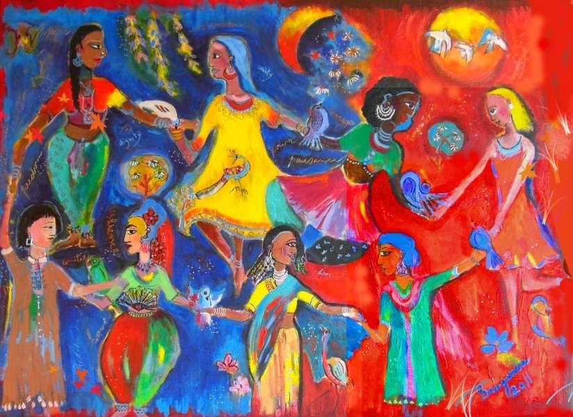 This painting envisions a future where women of all colors and cultures join hands to collectively effect positive change in the world. Where, by uniting with other women, they feel free: free to challenge and break boundaries, to empower other women, to make their own choices, to walk the streets unthreatened and to bring a new sense of peace and justice. The power of women is unmistakable as they gather momentum, finally recognize their true potential and rise up in revolution to effect real change around the world. This image was used by AMNISTIE INTERNATIONALE QUÉBEC for its 2013-2014 peace card.