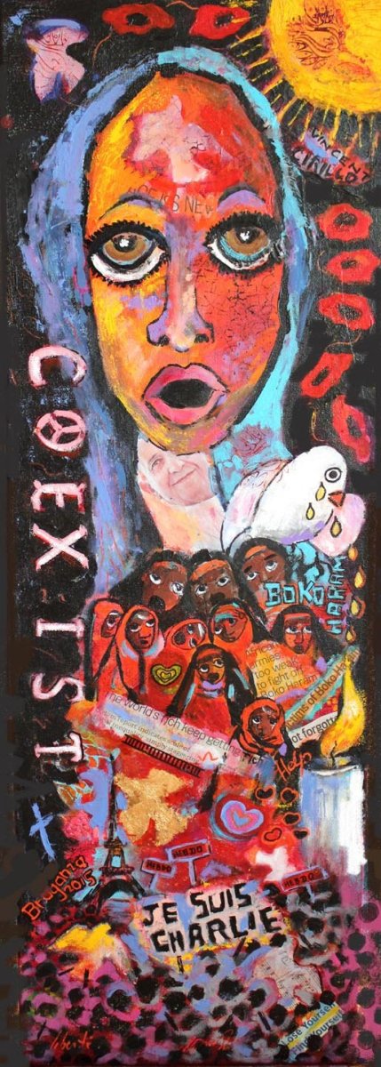12x36 in. mixed medium, January 15, 2015. As a new year unfolds, I scramble to find hope amidst troubling global events.
