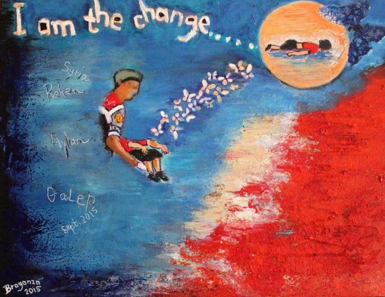 16x20 ins, mixed media. Sept. 6, 2015. Mahatama Gandhi's words "Be the change you want to see in the world" became especially poignant for me with the tragic photograph of little Aylan. Sadly, he became "the change" we so desperately yearn for in our complex universe.