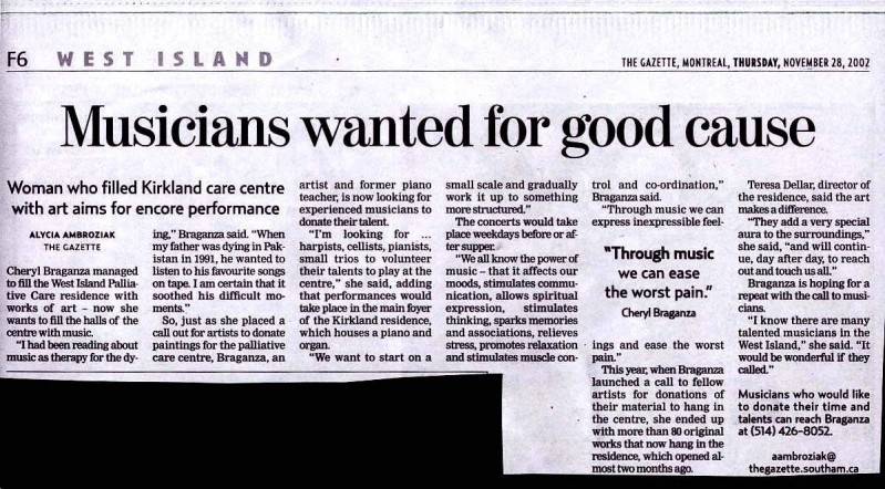 This was a public appeal that I made for musicians to come forward and offer their talents to perform at the West Island Palliative Care Center in Kirkland. I played the piano there myself and was heartened by the number of people who came forward and offered to share their talents. The Chronicle. 2003.