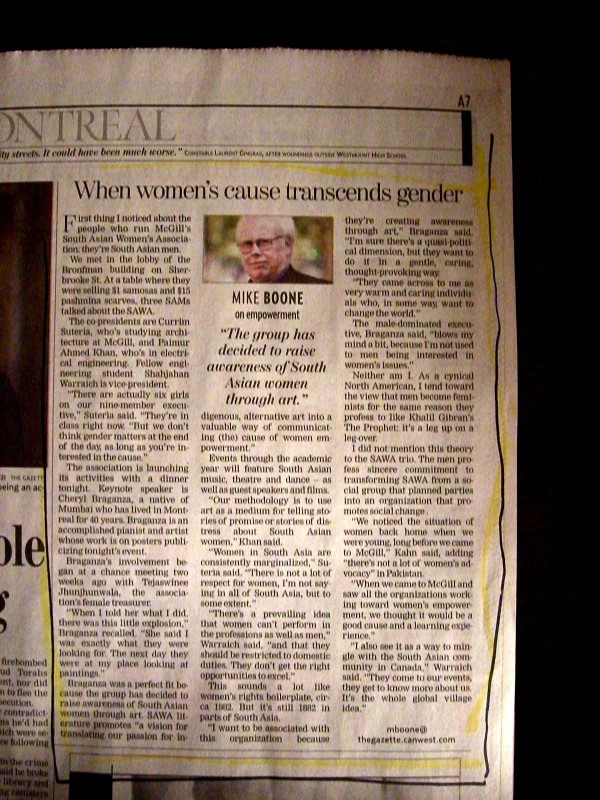 September 19, 2008 - WHEN WOMENS CAUSE TRANSCENDS GENDER by Mike Boone. Interview with members of SAWA and myself. Google the title to read the article in full.